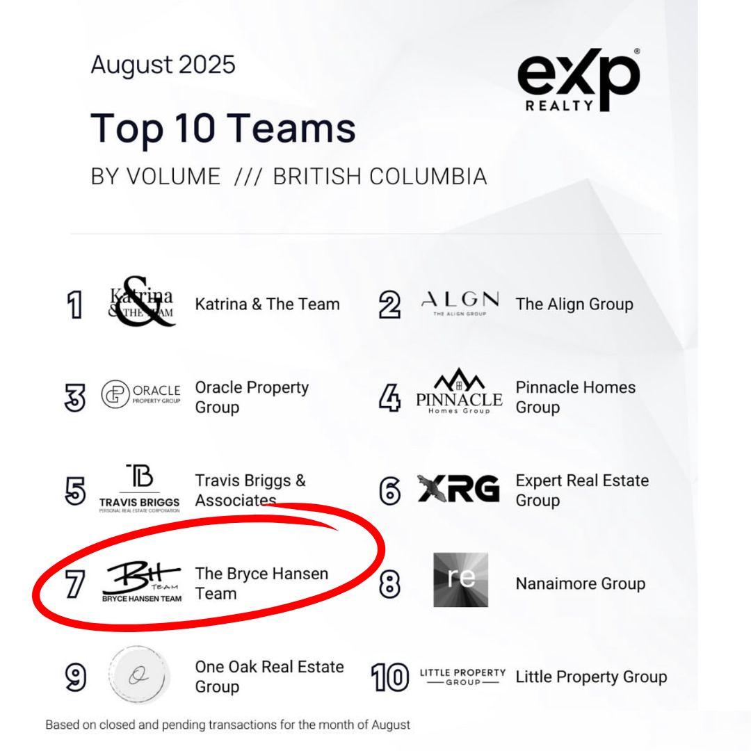 The Bryce Hansen Team is proud to share some exciting news! For August 2025, our team was recognized among the Top 10 real estate teams in British Columbia with eXp Realty.