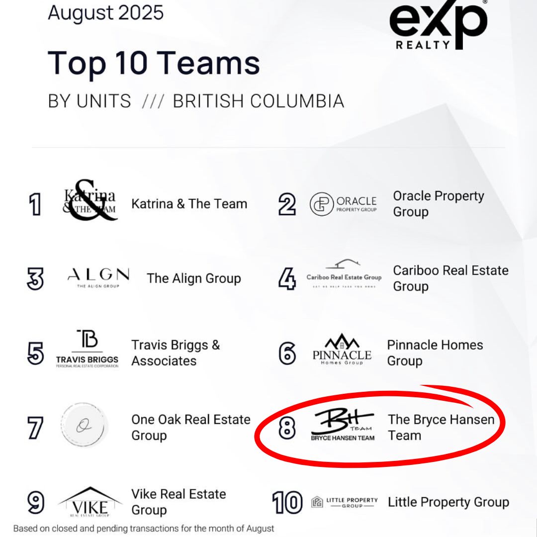 The Bryce Hansen Team is proud to share some exciting news! For August 2025, our team was recognized among the Top 10 real estate teams in British Columbia with eXp Realty.