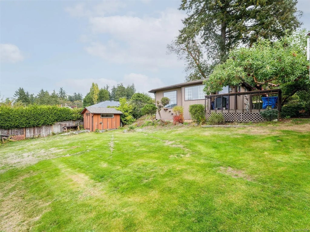 CHARMING CHARACTER HOME OVERLOOKING PASTORAL FIELDS. Rare opportunity to own a home with 21,700+ sqft lot, situated in a peaceful setting. This 2 bed home has seen several updates & has been well cared for. The spacious living rm is an inviting space to share w/ friends & family. The kitchen, w/ an adjacent dining rm, has been updated w/ newer appliances, Quartzite countertops, new hardware & a dbl sink w/ filtered water. The island w bar seating features a modern gas cooktop. Imagine cozying up to the fireplace, or taking in the spectacular sunsets from the private deck off the primary bedrm. Updated 4 pc bathrm w walk-in shower, soaker tub, & convenient laundry complete this level. The basement offers a great storage space & a workshop. The beautiful tiered yard has been thoughtfully landscaped w/ 2 ponds, fire pit, peach tree & 2 wired storage sheds. BONUS self-contained private cottage, w greenhouse. Close to shopping, Camosun Interurban, VGH & transit.