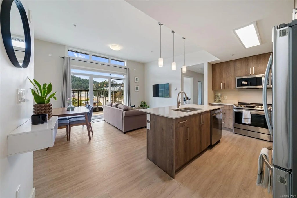 Open House Saturday Oct 18, 11AM-1PM, Sunday Oct 19, 12PM-2PM! Top-floor west-facing 2 bed + den, 2 bath condo at Thetis Lakeside! Offering 1,055 sq. ft. of bright living space, this home features soaring 9’ vaulted ceilings that go up to over 11' with extra windows for natural light, plus an oversized deck with views to the Olympic Mountains. The open concept layout includes a modern kitchen with quartz countertops & stainless appliances, flowing to a spacious living/dining area. The primary bedroom boasts a large walk-in closet & space for an office/reading nook, while the 2nd bedroom also has a generous walk-in closet. European vinyl plank flooring adds style throughout. Extras include 2 storage lockers & 1 parking stall. Pet-friendly with large dogs allowed (no weight restrictions)! Building offers 2 elevators, dog area, bike storage, e-car spaces & ample visitor parking. Steps to Thetis Lake Park & the Galloping Goose, and minutes to shopping, dining & recreation. Rentals allowed!